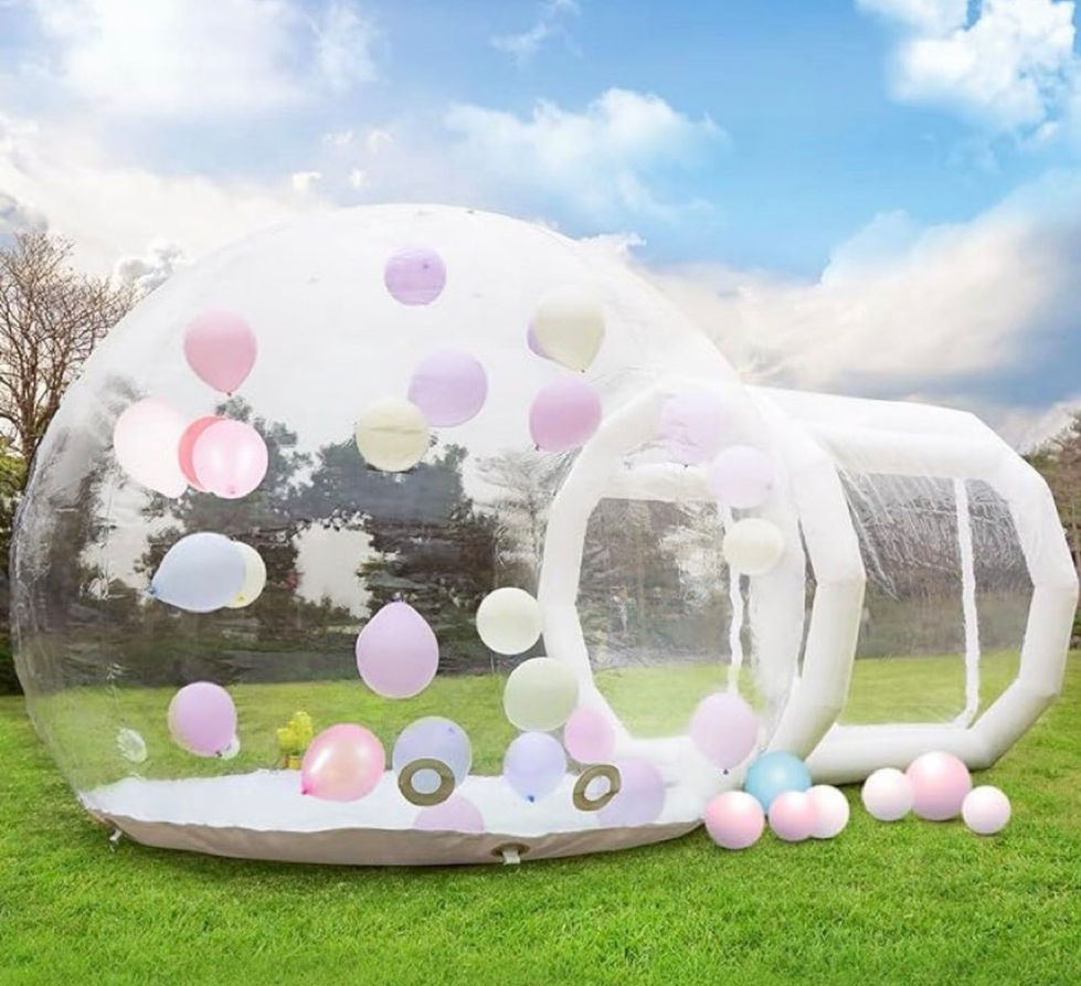 This project showcases various inflatable decorations, including a white inflatable castle with colorful balloon decorations and a transparent inflatable dome with colorful balloons inside. The playful and whimsical designs are perfect for creating a fun and inviting atmosphere at any event.